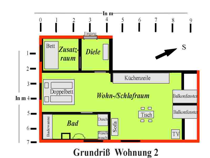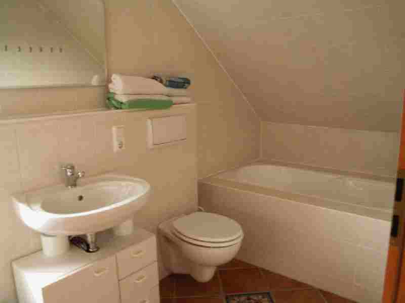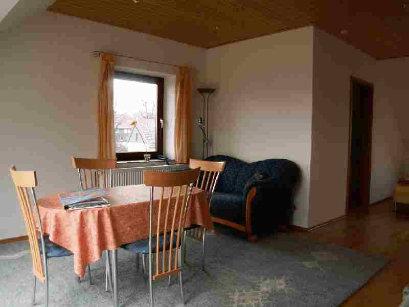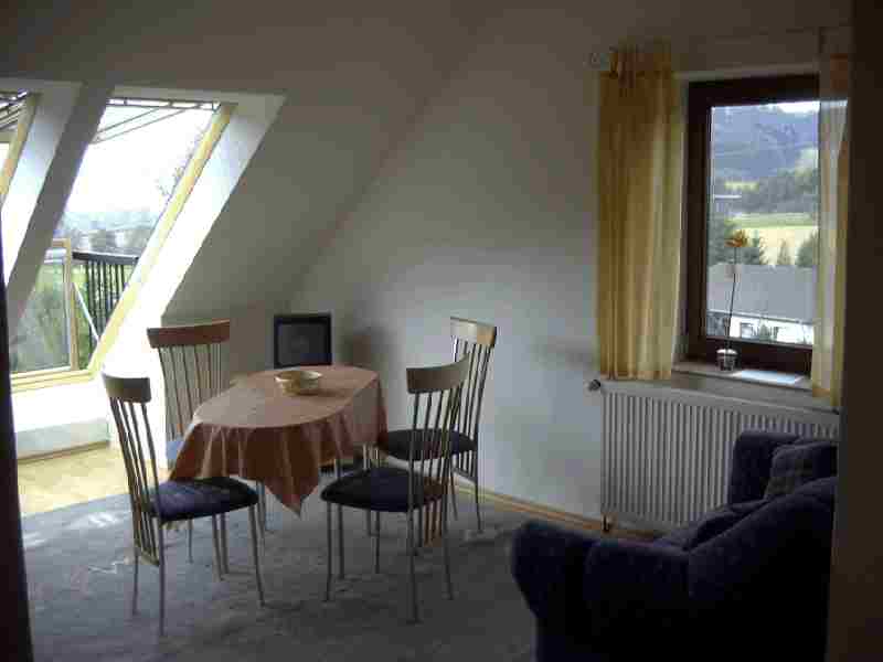 Das ca. 50 m² große Appartement besteht aus einem Wohn-/Schlafraum, einer vollwertigen Küchenzeile (mit Spül- und Kaffeemaschine, Herd und Kühlschrank) und einem separaten Badezimmer mit Dusche und Badewanne. Eine Waschmaschine ist ebenfalls vorhanden. In der Diele befindet sich eine kleine Garderobe. Bei Bedarf kann ein zusätzlicher Raum mit einem Bett (z.B. für ein Kind) und/oder ein weiterer Schlafraum mit 2 Betten zugemietet werden. Alle Räume haben Parkettfußböden. Darauf befindet sich ein großer Berberteppich- besonders im Winter sehr gemütlich! Zwei Dachbalkonfenster lassen sich nach Süden hin öffnen (mit einem weiten Blick auf Felder und Wiesen), ein Fenster weist nach Westen (mit Sicht über das Dorf). |