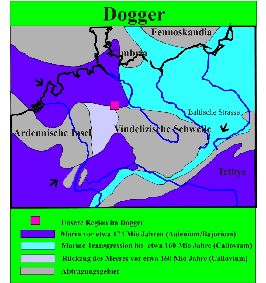 Durchbruch der baltischen Meeresstrasse nach Osten hin führte. Im Norden taucht eine Insel auf (Cimbria), die die Verbindung zum Nordmeer einengt. Im Oberen Dogger weitet das Meer sich insgesamt sehr weit nach Osten
