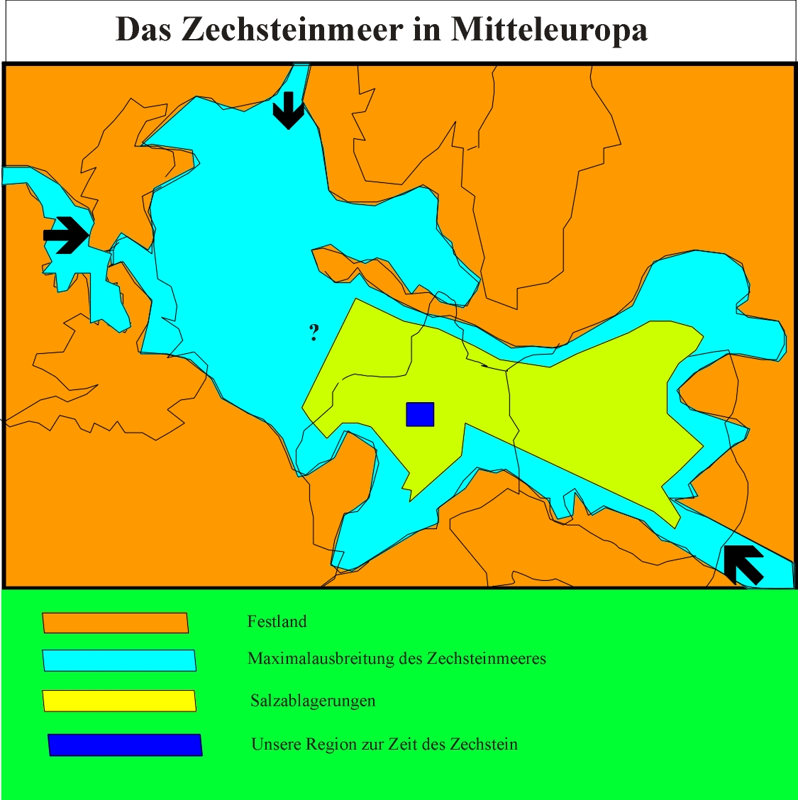 Wie bereits im Rotliegend transgrediert das Meer von Norden her. Als Binnenmeer war das Zechsteinmeer sehr stark von dem Zusammenhang mit der offenen See abhängig. Erweiterungen und Verengungen in den