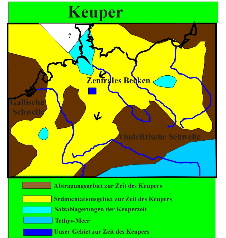 Unsere Region befand sich zur Zeit des Keupers auf ca. 15° nördlicher Breite, also in den Tropen. Im Keuper begannen sich Flußdeltas in in das Germanische Becken vorzuschieben. Mergel- und Sandsteinfolgen