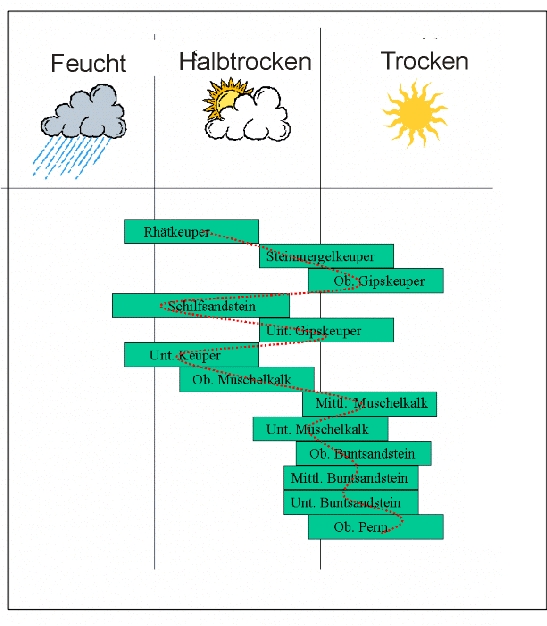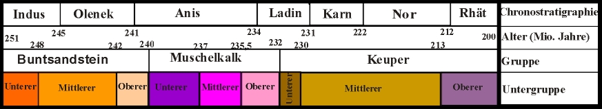 , abgelöst. Schließlich folgt eine Periode mit weitgehend festländischer Sedimentation, der Keuper (232-200 Mio Jahre).