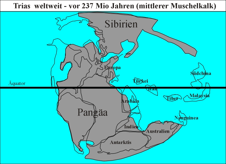heutigen Sibirien diskutiert.Neue Tiere treten auf: Saurier und die ersten Säuger. Bei den Ammonoideen sind es die Ceratiten, die zu neuer Blüte gelangen.