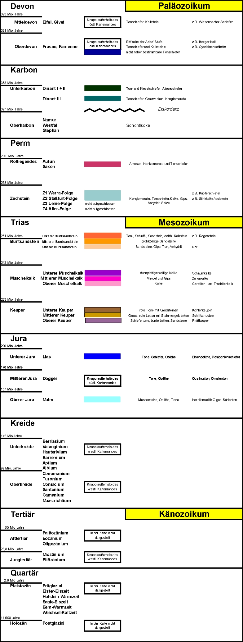Viele der einzelnen “Stufen” sind noch einmal weiter untergliedert. Ihre absolute Zeitbestimmung (oft noch in der Literatur umstritten) ist angegeben. Der letzte Zeitabschnitt, das Holozän, ist der Übergang zu den geschichtliche Abläufen, die Bad Gandersheim und seine Umgebung prägten. Hier wird dann auf die mittelalterliche Geschichte verwiesen