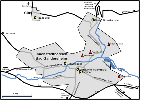 So präsentiert sich die Kurstadt Bad Gandersheim. Begleiten Sie uns auf einem kleinen Spaziergang duch die Stadt. Wir zeigen Ihnen die Highlights, die Sie gesehen haben sollten. Die gelb dargestellten Sehenswürdigkeiten sind näher beschrieben.